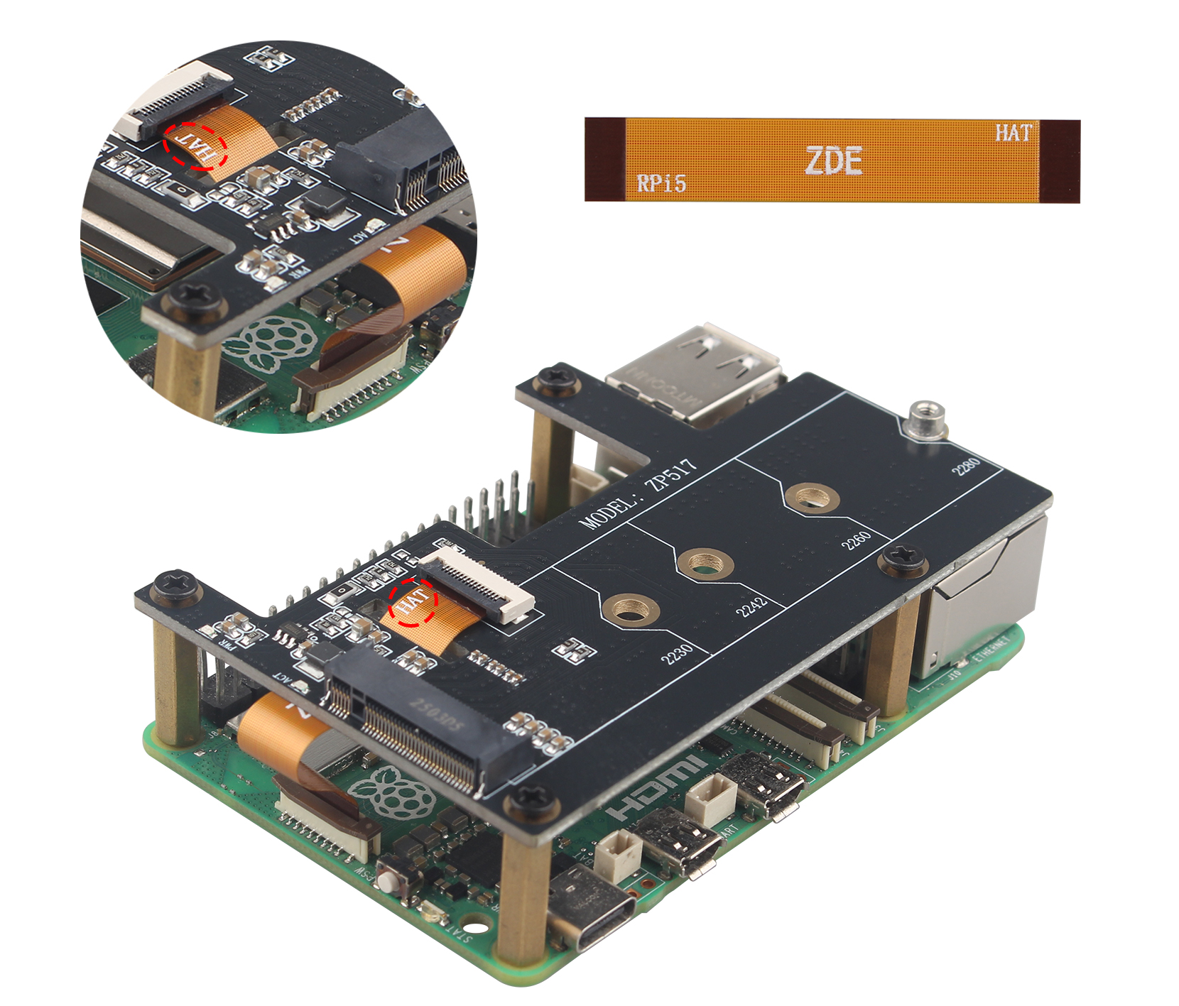 • ZDE ZP517A M.2 NVMe to PCIe适配器板专为最新的Raspberry Pi 5设计,支持安装2230/2242/2260/2280的M.2 KEY-M NVMe固态硬盘。